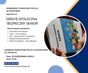 - Zapraszamy na debatę społeczną Już w najbliższą środę tj. 22 października br. o godz. 11:00 w sali konferencyjnej w Komendzie Powiatowej Policji w Szczecinku odbędzie się debata społeczna pn. "Bezpieczny Senior". Spotkanie nie jest dedykowane tylko seniorom, ale każdej osobie, która ma ochotę dowiedzieć się jak działają oszuści i jaki wpływ na własne bezpieczeństwo ma każdy z nas. Szczecineccy policjanci serdecznie zapraszają.