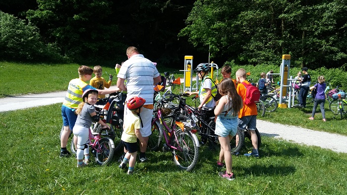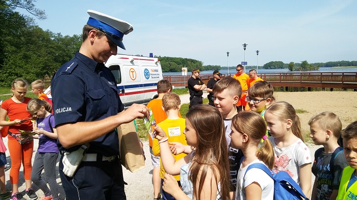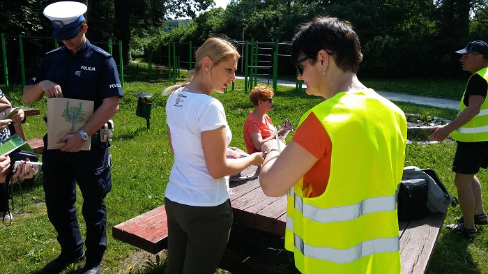 Chwila przerwy i wytchnienia dla uczestników okazała się sposobnością do rozmowy mundurowych z rowerzystami na temat bezpieczeństwa. O tym jak bezpiecznie i zgodnie z przepisami poruszać się po drodze instruował sierż. sztab. Kamil Nowacki z Ogniwa Ruchu Drogowego Komendy Powiatowej Policji w Szczecinku. Dla wytrwalszych i bardziej dociekliwych słuchaczy pojawiły się drobne upominki, które przydadzą się każdemu rowerzyście, który myśli o swoim bezpieczeństwie czyli kamizelki odblaskowe.