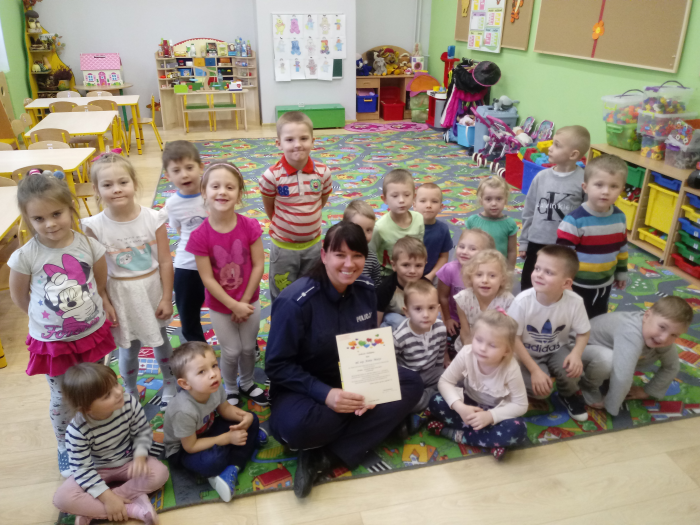 Program opracowany przez wychowawcę grupy „Jagódek” Panią Joannę Sobolewską idealnie wpasował się w zadania profilaktyczne realizowane przez mundurowych na co dzień. Tym razem poprzez książkę i zawartą w niej historię policjantka starała się przestrzec małych przedszkolaków przed konsekwencjami rozmów z osobami, których nie znają. Główny bohater musi dokonać wyboru: posłuchać mamy czy pójść z mężczyzną, który zaoferował mu pomoc? Wsłuchane w treść bajki dzieci, doskonale widziały jak powinny postąpić w tak trudnej sytuacji. Bezpieczny przedszkolak doskonale wie, że nie rozmawia się z nieznajomymi. Bajka okazała się pretekstem do bardzo ożywionej dyskusji na temat zasad i przestróg jakie wpajają rodzice swoim pociechom na co dzień.