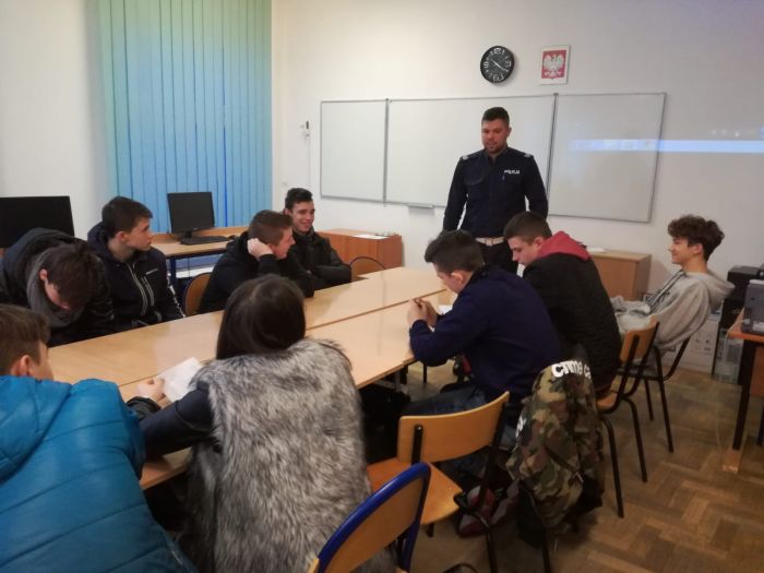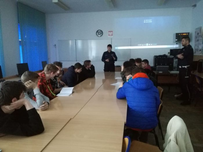 Policjant ze szczecineckiej drogówki spotkał się dziś z uczniami klas VII i VIII Prywatnej Szkoły Podstawowej dla Dorosłych w Szczecinku będących jednocześnie uczestnikami Hufca Pracy OHP w Szczecinku. Głównym celem spotkania było bezpieczeństwo w ruchu drogowym.