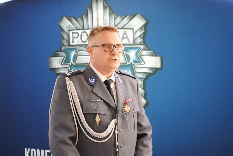 Nie mogło jednak zabraknąć szefa szczecineckiej jednostki i sztandaru, na który ślubują policjanci. Żeby podkreślić doniosłość tej chwili, insp. Andrzej Dziemianko Komendant Powiatowy Policji w Szczecinku odczytał słowa roty ślubowania.