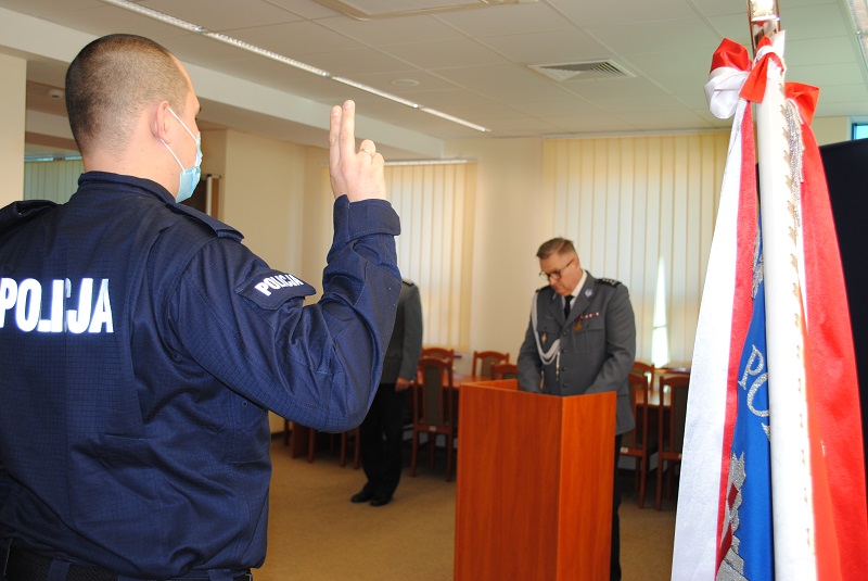 W piątek (20.11.2020r.) w sali konferencyjnej Komendy Powiatowej Policji w Szczecinku odbyło się ślubowanie przyjętych do służby policjantów. Z uwagi na pandemię wywołaną koronawirusem (COVID-19) ślubowanie nowo przyjętych funkcjonariuszy odbyło się w skromniejszej niż dotychczas formie. Nie było zaproszonych gości, a bliscy policjantów nie mogli być świadkami tej ważnej chwili.