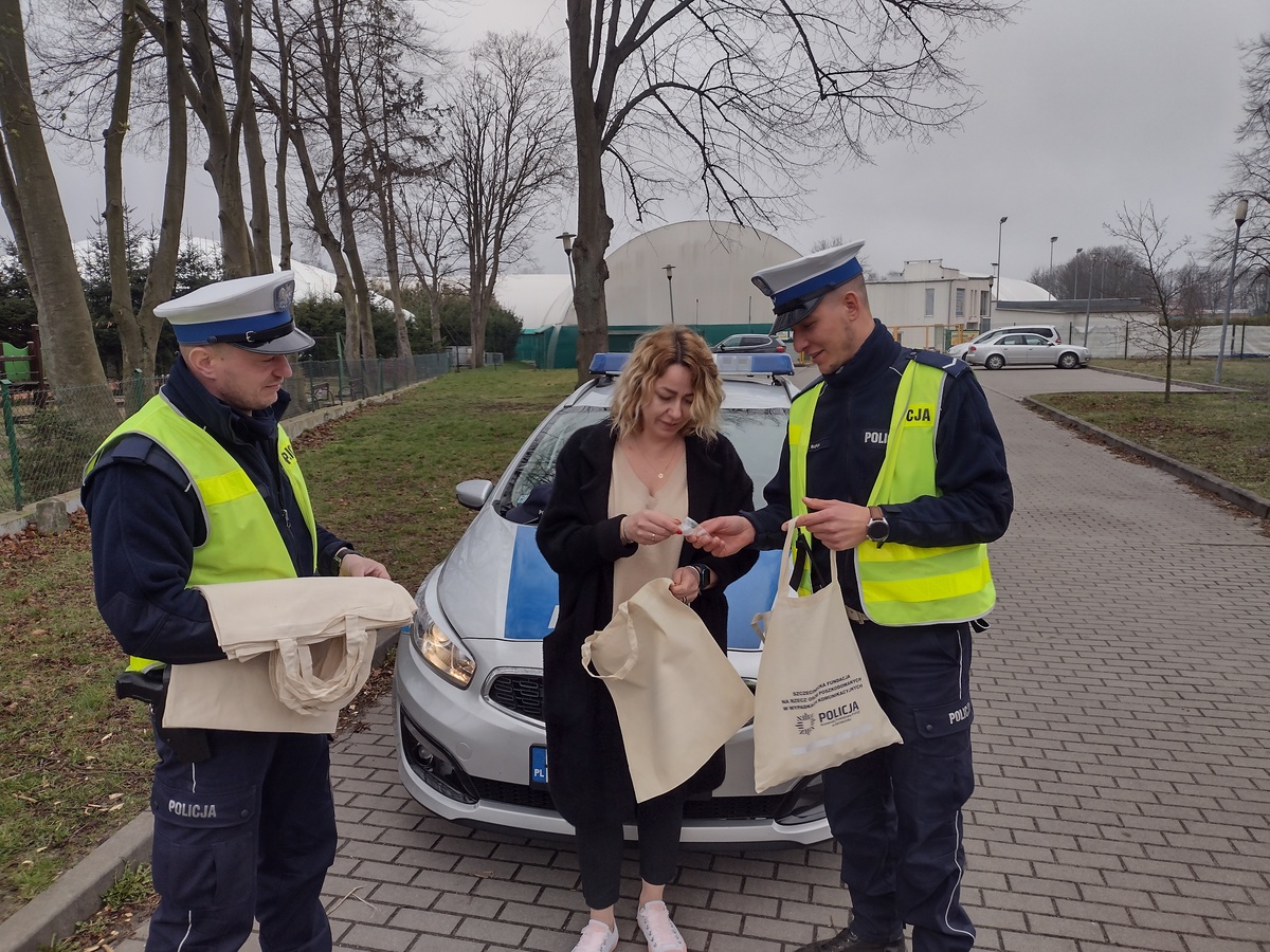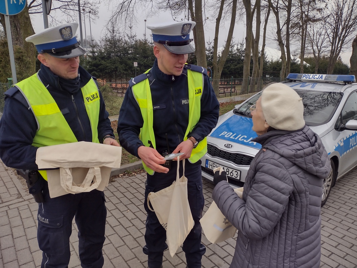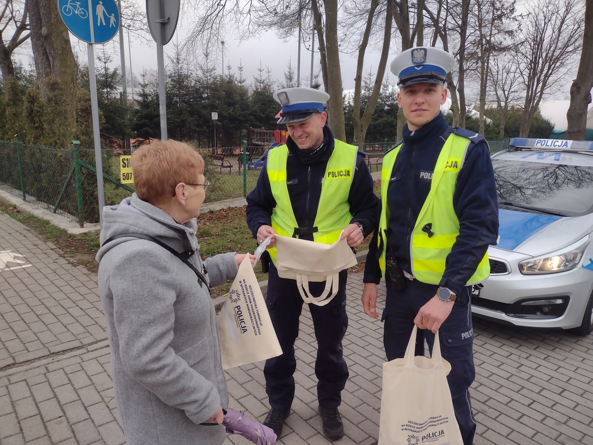 Wraz z życzeniami radosnych i spokojnych świąt policjanci wręczali bawełniane torby z elementem odblaskowym oraz światełka dla rowerzystów. Wspomniane drobiazgi mają uświadomić mieszkańcom naszego miasta, że o bezpieczeństwie myśli się każdego dnia, szczególnie w ten świąteczny czas.