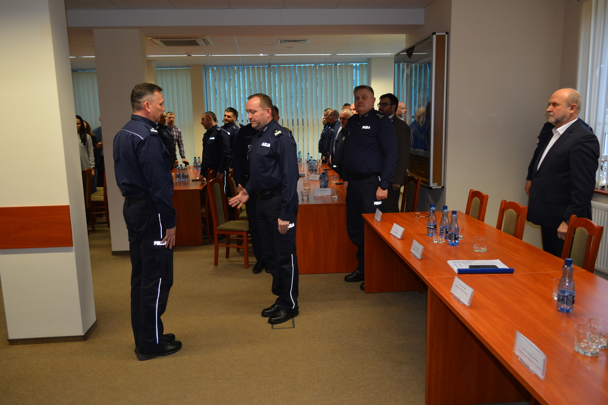 W trakcie wystąpienia Komendant podziękował przedstawicielom wszystkich władz samorządowych i instytucjom za codzienną współpracę z naszą jednostką. Zwrócił uwagę jak ważne jest ich wsparcie, także to finansowe. Dzięki płynącemu wsparciu finansowemu ze strony Starostwa i Urzędu Miasta Borne Sulinowo w tym roku będzie możliwe zakończenie ostatniego etapu modernizacji Komisariatu Policji w Bornem Sulinowie. Również dzięki wsparciu finansowemu od Burmistrza Miasta Szczecinek oraz Nadleśnictwa Tychowo możliwy był zakup dwóch nowych radiowozów dla szczecineckich policjantów. Komendant podziękował wszystkim uczestnikom odprawy za wspólny wysiłek na rzecz poprawy bezpieczeństwa mieszkańców powiatu. Szczególne podziękowania skierował do policjantek i policjantów, którzy swoim zaangażowaniem w codzienną służbę dbają o to by mieszkańcy Szczecinka i powiatu mogli czuć się bezpiecznie w swoim miejscu zamieszkania