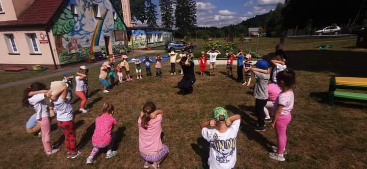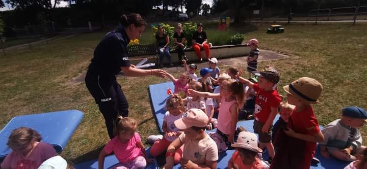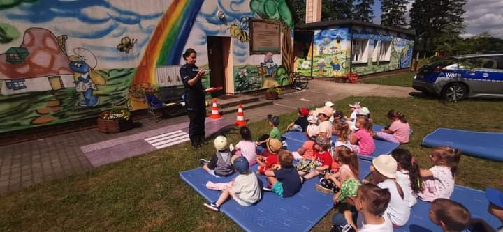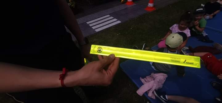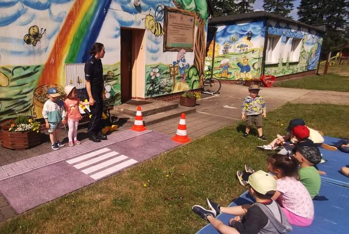 Policjantka podczas spotkania omówiła również ważną kwestię dotyczącą bezpieczeństwa w ruchu drogowym. Nie obyło się bez wspólnych ćwiczeń prawidłowego przechodzenia przez przejście dla pieszych, omówienia ważnych znaków drogowych mających wpływ na poczucie bezpieczeństwa dzieci na drodze oraz ważnej roli elementów odblaskowych. Wszyscy mali uczestnicy spotkania z policjantką otrzymali na zakończenie element odblaskowy.