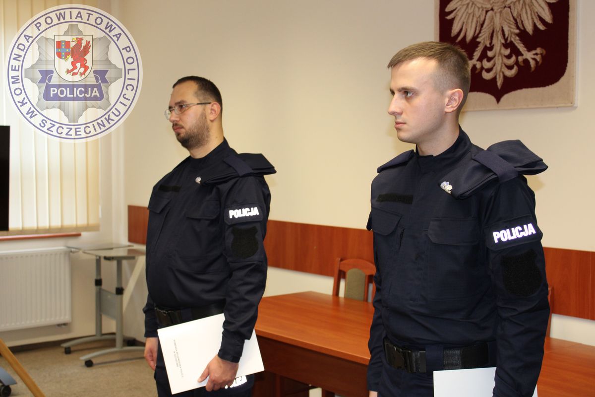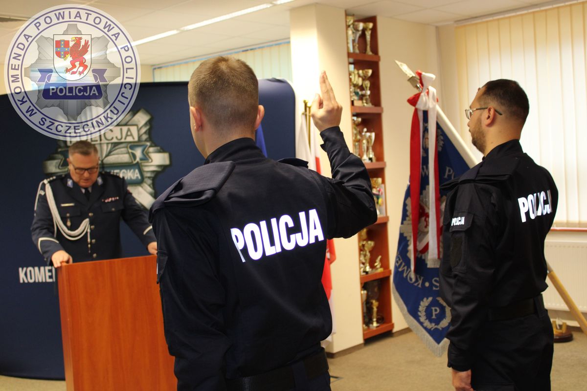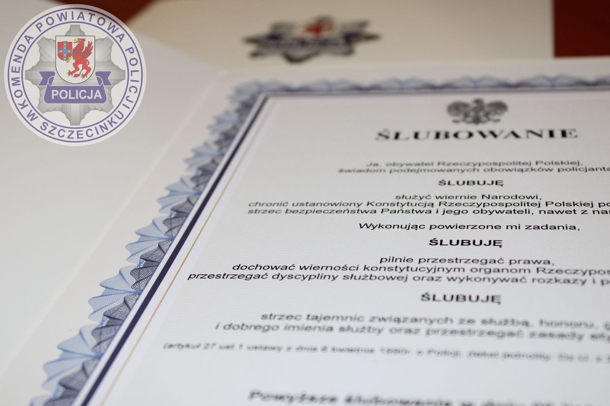 Dzisiaj w sali konferencyjnej Komendy Powiatowej Policji w Szczecinku nowi funkcjonariusze złożyli uroczyste ślubowanie. Jest to ważny dzień dla każdego młodego policjanta i jedna z pierwszych jakże ważnych uroczystości. Po wypowiedzeniu roty ślubowania Komendant Powiatowy Policji w Szczecinku insp. Andrzej Dziemianko pogratulował nowym funkcjonariuszom wyboru drogi życiowej i wstąpienia w szeregi policyjnej formacji. Podkreślił, że zobowiązali się oni strzec bezpieczeństwa, służyć obywatelom, a codzienną służbę powinni pełnić godnie i traktować ją z najwyższą powagą. Przed młodymi stażem funkcjonariuszami kilkumiesięczny kurs podstawowy oraz adaptacja zawodowa. Po ich zakończeniu nowi policjanci rozpoczną służbę w naszej jednostce, gdzie będą dbać o bezpieczeństwo mieszkańców naszego powiatu.