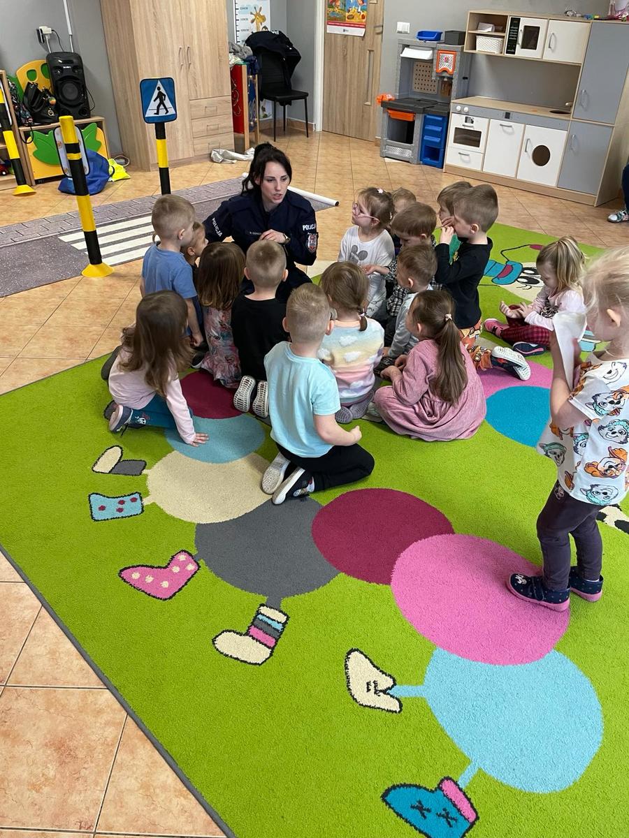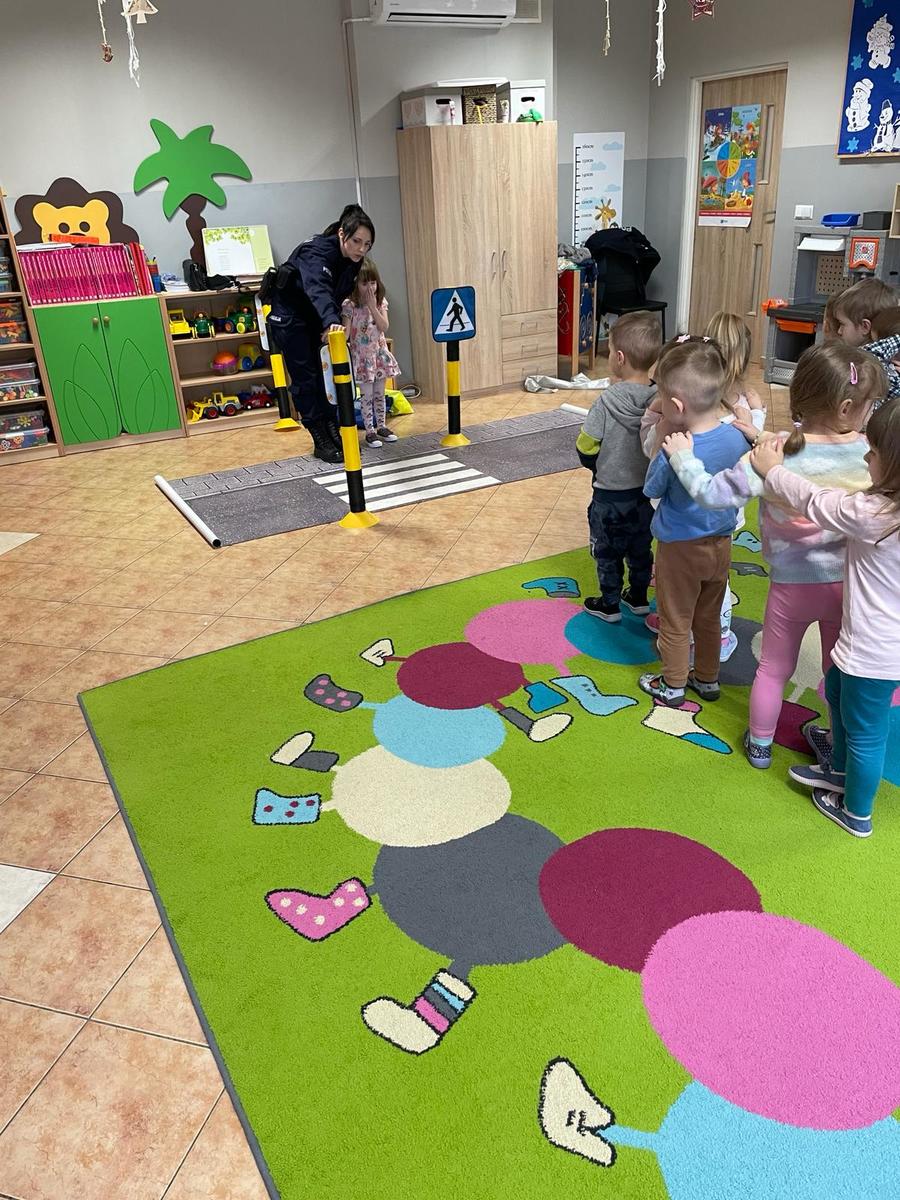 Funkcjonariuszka wspólnie z dzielnicowym Komendy Powiatowej Policji w Szczecinku, udali się do Niepublicznego Przedszkola „Kredka” w Szczecinku na spotkanie warsztatowe dotyczące bezpieczeństwa w ruchu drogowym.
