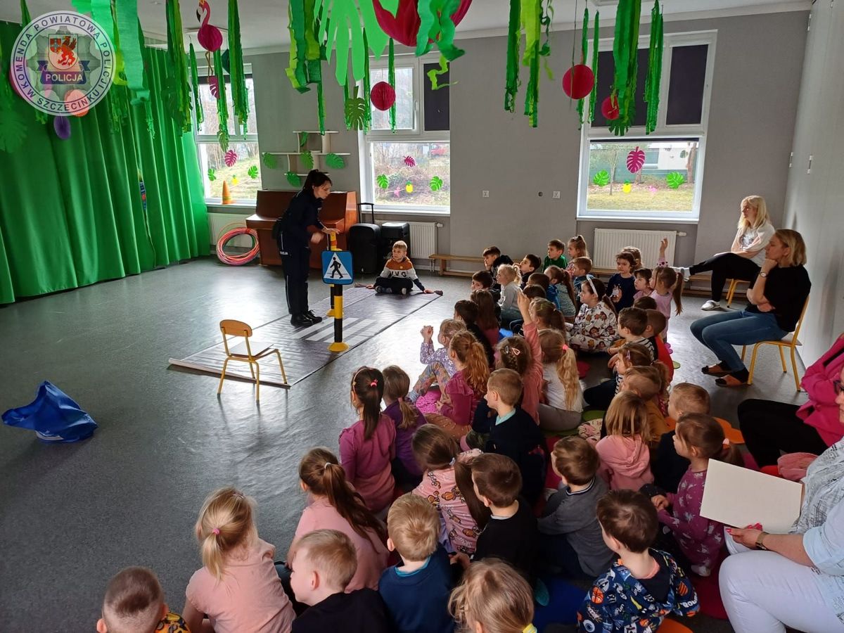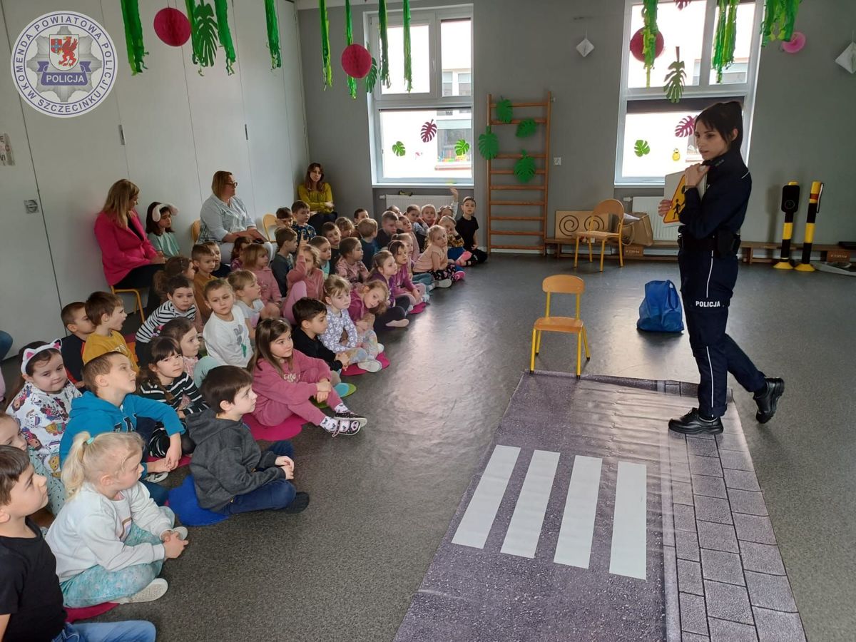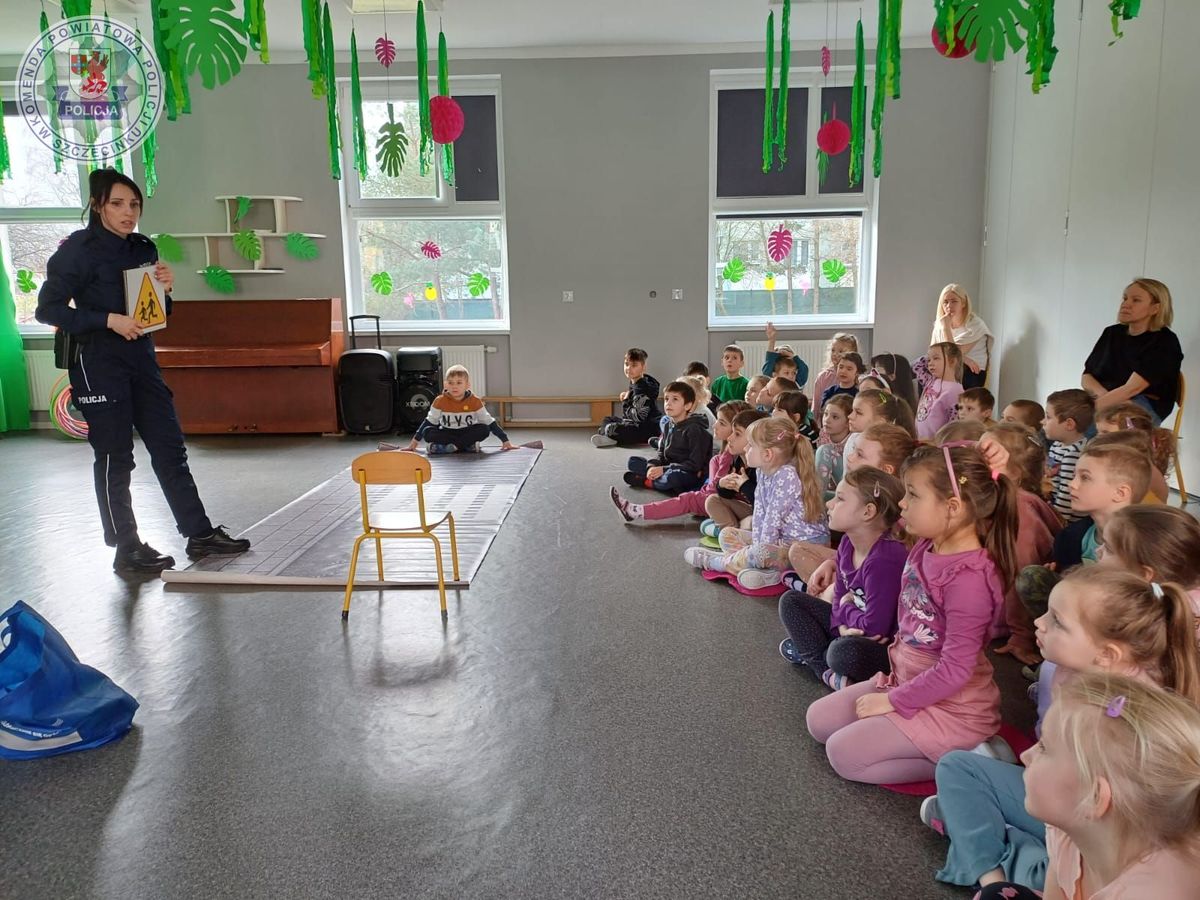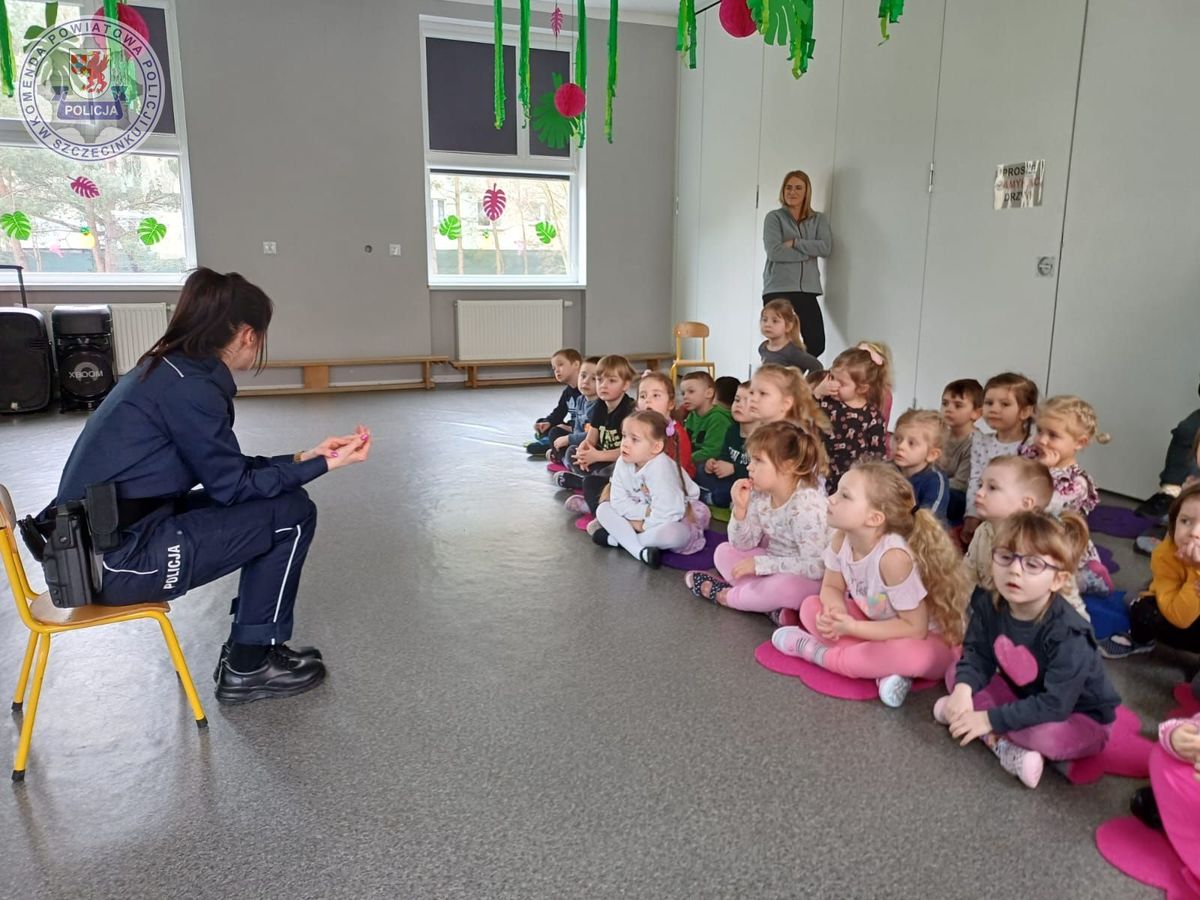 Policjantka podczas wizyty w przedszkolu omawiała podstawowe zasady bezpieczeństwa podczas zabawy na placu zabaw, w przedszkolu, a także o unikaniu kontaktu z osobami nieznajomymi. Najmłodsi nauczyli się jak bezpiecznie przejść przez przejście dla pieszych, a do tego mogli to udoskonalać pod czujnym okiem funkcjonariuszki. Podczas pogadanki policjantka wspomniała jak ważna jest właściwa reakcja na trudne zdarzenia i gdzie można zgłosić się o pomoc, dzwoniąc chociażby na numer alarmowy 112.