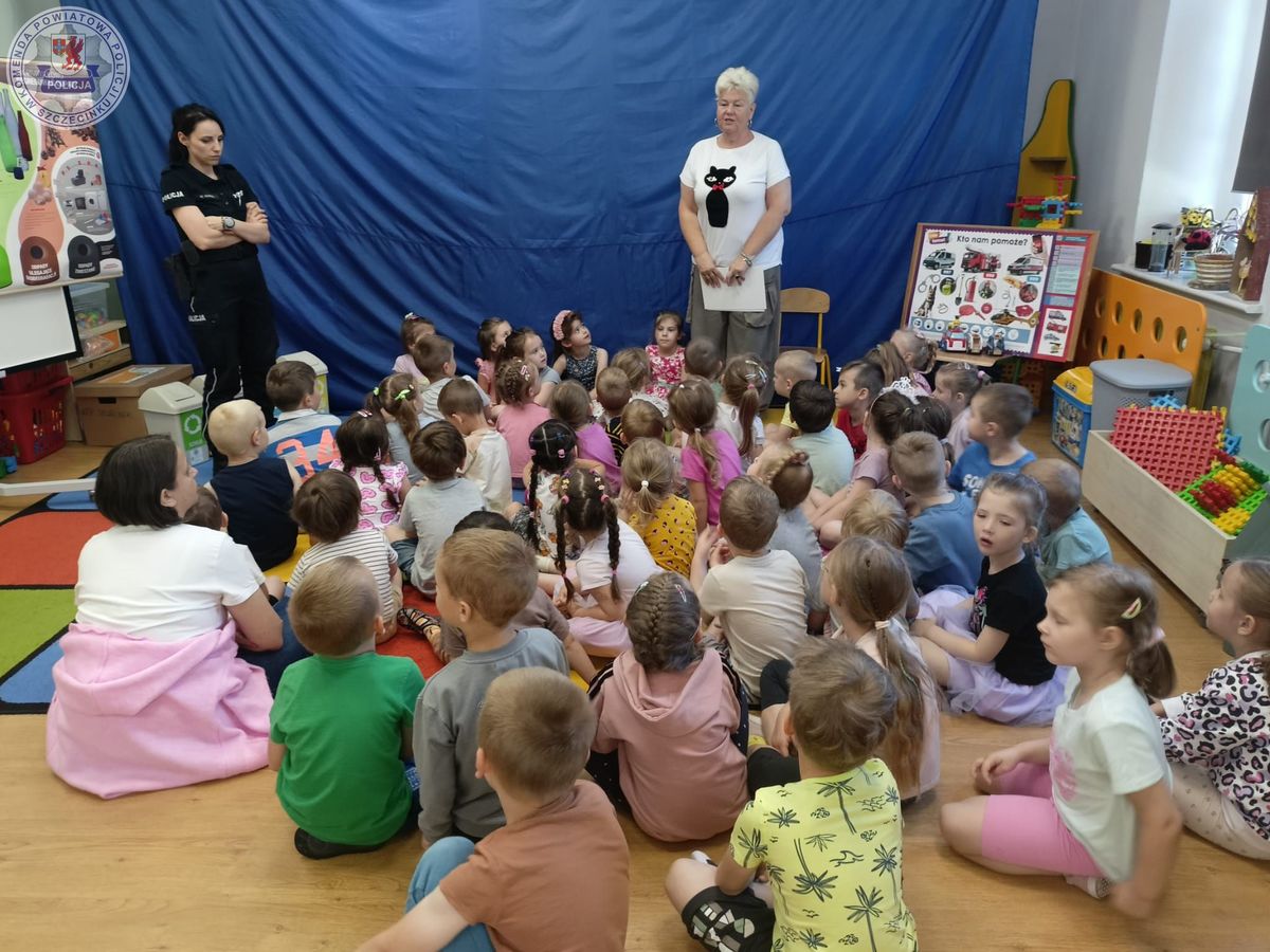 Policjantka z Komendy Powiatowej Policji w Szczecinku wspólnie z promotorem zdrowia z PSSE spotkała się z przedszkolakami z Publicznego Przedszkola im. K.Makuszyńskiego w Szczecinku by porozmawiać z nimi o bezpiecznym wypoczynku podczas letnich wakacji.