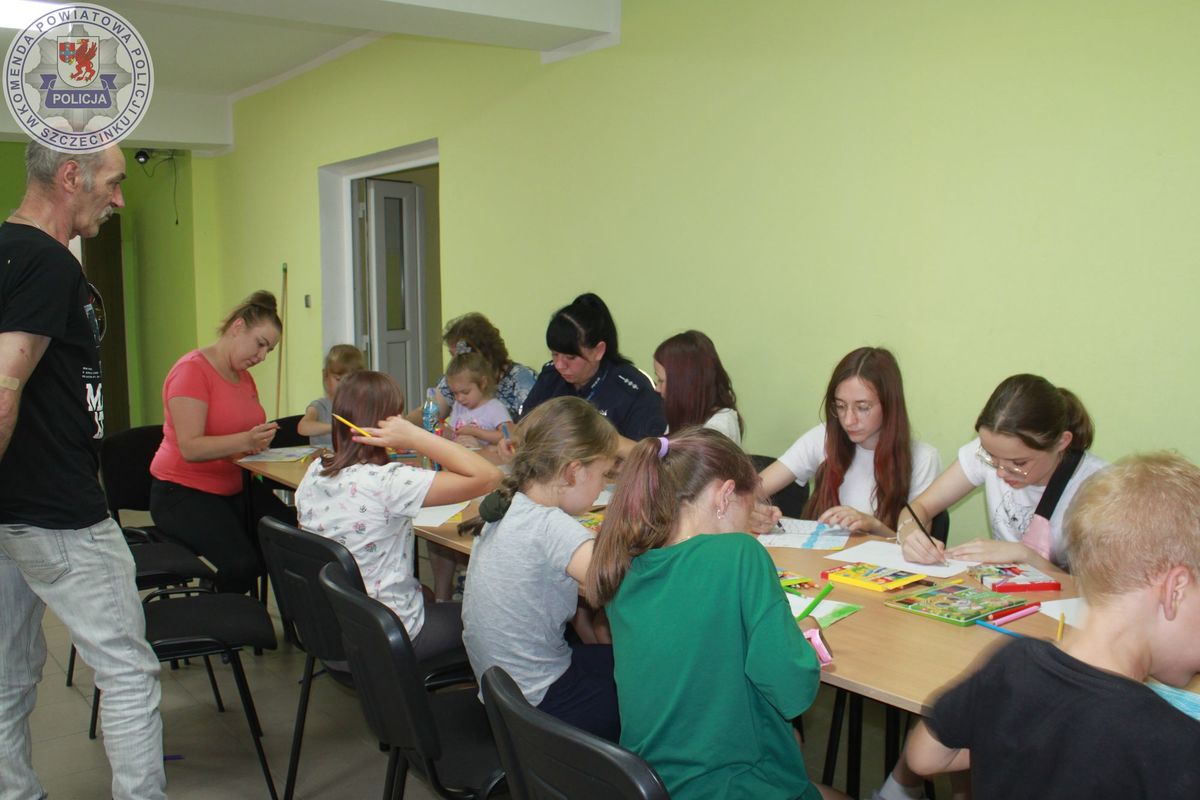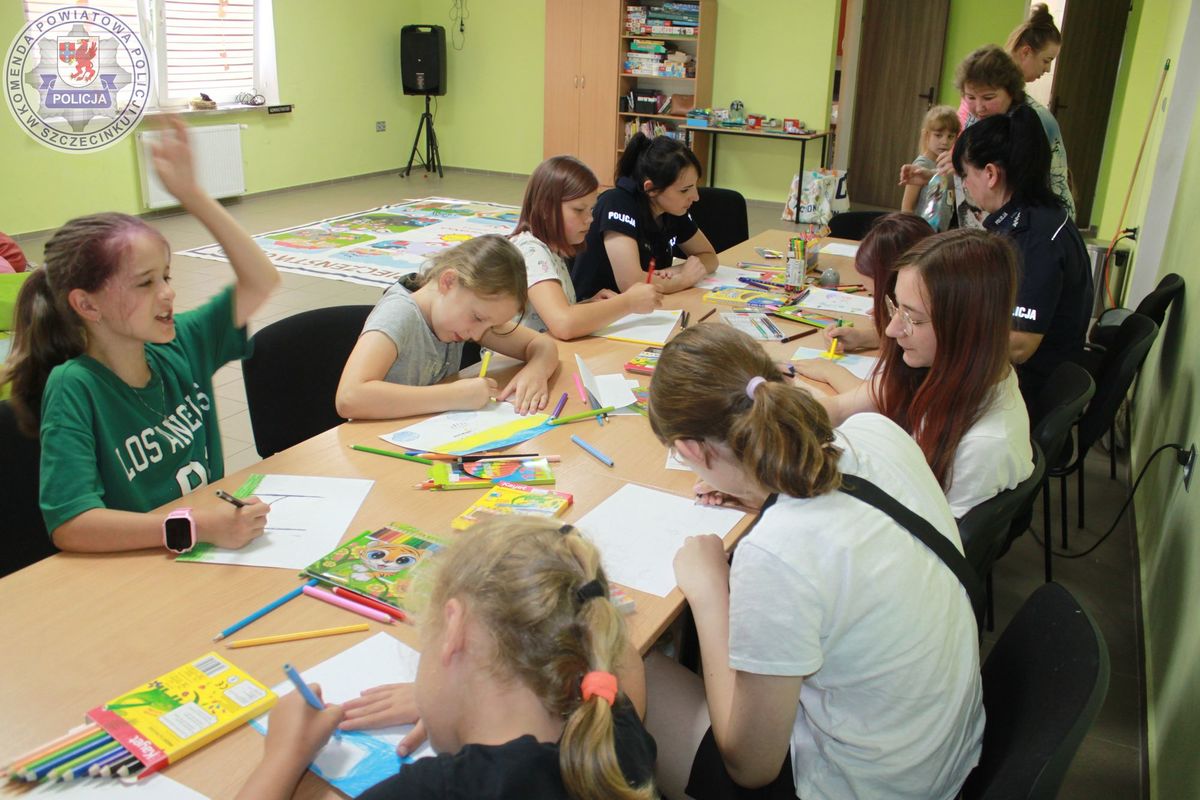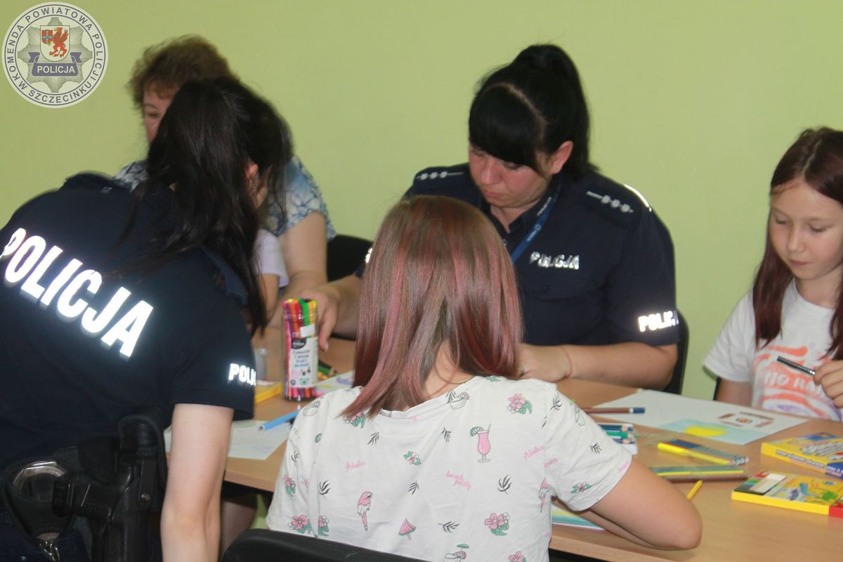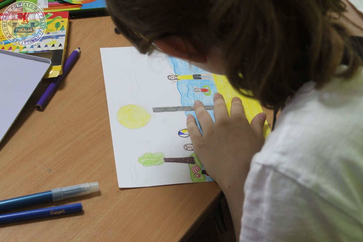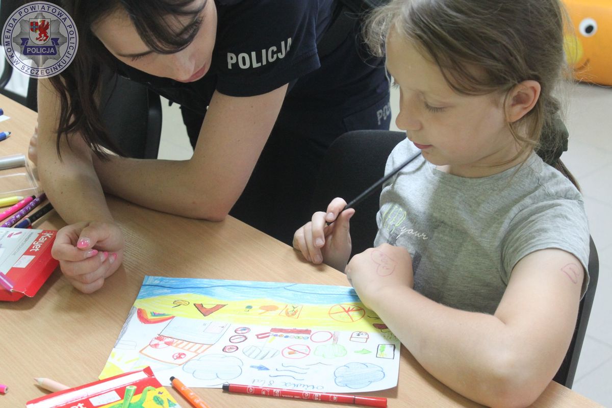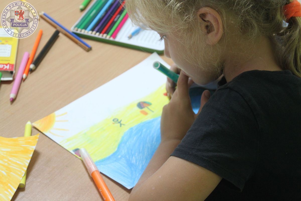 Po cennych wskazówkach dzieci wzięły udział w konkursie plastycznym pn.: „Bezpieczne wakacje”. Szybko na kartkach papieru pojawiły się bezpieczne zachowania i plaże przyjazne dziecku. Czas wykonywania prac plastycznych w towarzystwie policjantek sprzyjał długim rozmowom i spostrzeżeniom dzieci na temat bezpiecznych zachowań.