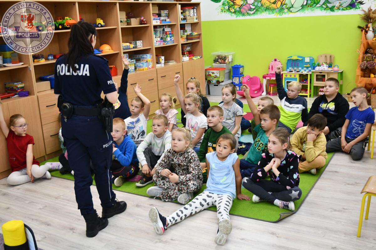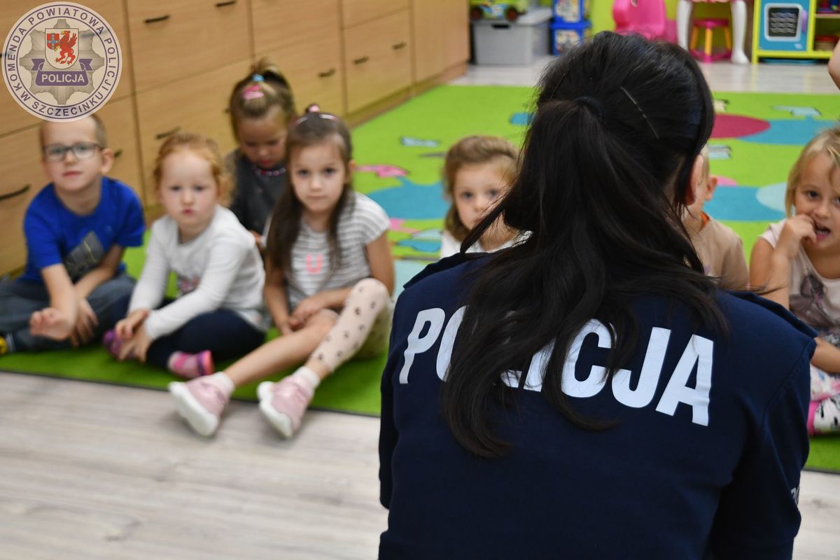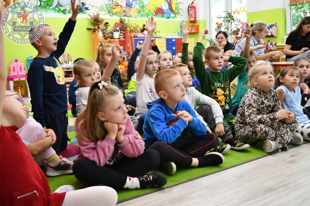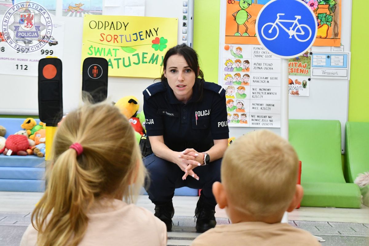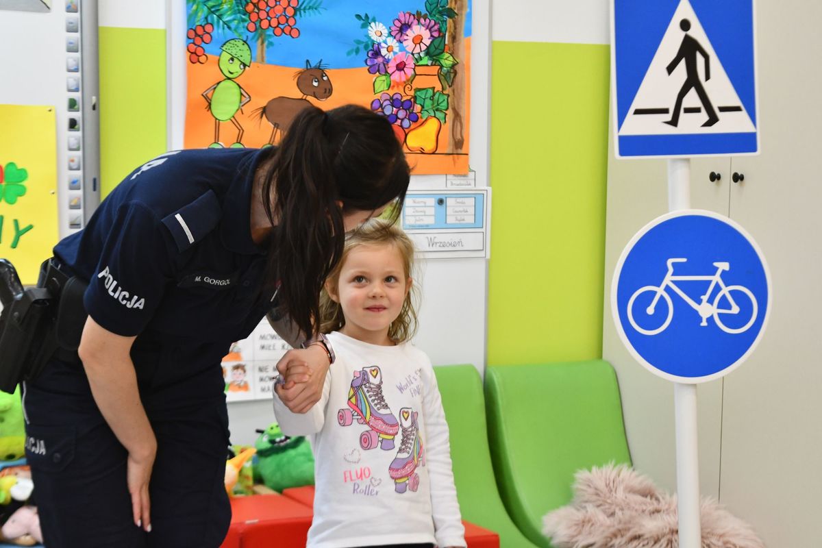 Podczas spotkania policjantki rozmawiały z przedszkolakami o zasadach zachowania bezpieczeństwa w drodze do przedszkola, w domu oraz na placu zabaw. Maluchy dowiedziały się, jak ważne jest noszenie w miejscu widocznym elementów odblaskowych i jak bardzo dzięki nim jesteśmy widoczni dla innych uczestników ruchu drogowego.