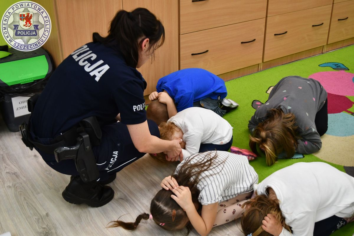 Przedszkolaki a pożniej starsza grupa uczniów klas 1-3 wykazały się znajomością numeru alarmowego 112, i dowiedziały się jakie informacje należy przekazać podczas zgłoszenia. Dzięki wykorzystaniu elementów drogi uczniowie pod czujnym okiem policjanctki doskonaliły umiejętność poruszania się po drodze.