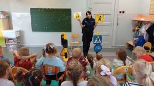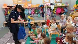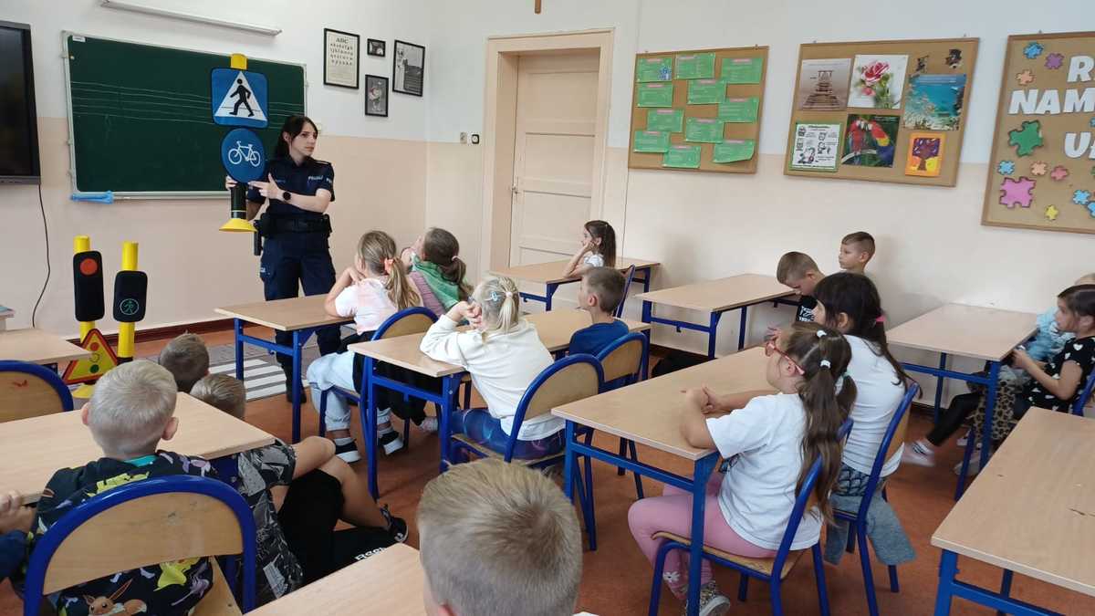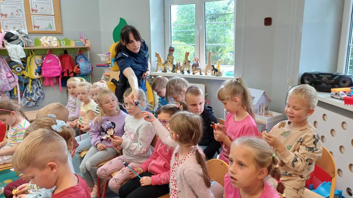 Profilaktyk ze szczecineckiej komendy objaśniła uczniom, co oznacza bardzo ważne słowo – bezpieczeństwo. Na zakończenie prelekcji uczniowie zadawali pytania dotyczące bezpieczeństwa oraz dzielili się swoimi spostrzeżeniami. W nagrodę za aktywny udział w spotkaniu uczniowie otrzymywali elementy odblaskowe.