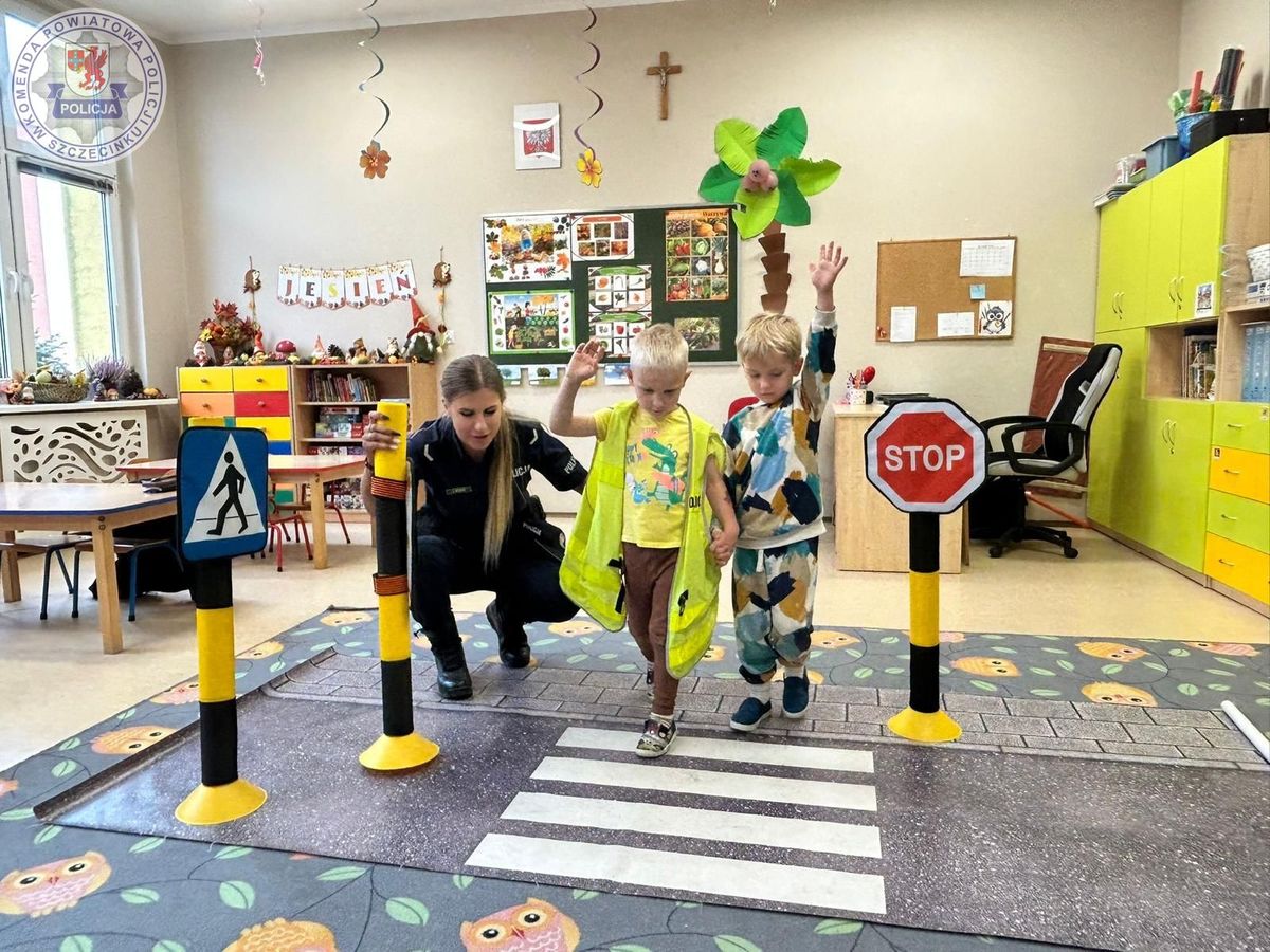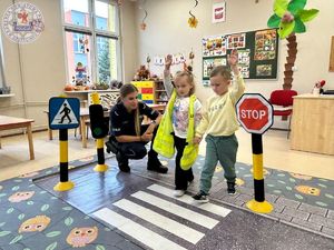 Najbardziej jednak wszystkim podobała się zabawa, podczas której dzielnicowa sprawdzała i podpowiadała jak prawidłowo przechodzić przez przejście dla pieszych. Żywa lekcja bezpieczństwa z udziałem stróża prawa na pewno zostanie na długo w pamięci przedszkolaków. Nie jeden z nich zapewne po powrocie do domu będzie opowiadać rodzicom tak uwielbiane przez nas historie: - "a Pani Policjantka powiedziała…!", bo przecież bezpieczeństwo najmłodszych to nasz wspólny cel.