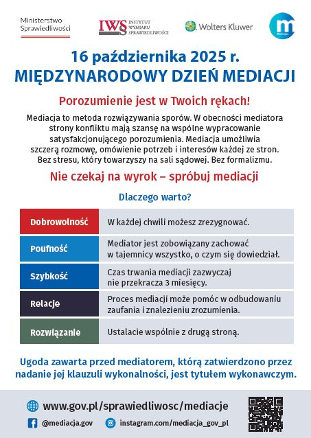 Materiały informacyjne oraz harmonogram wydarzeń związanych z wydarzeniem będą publikowane na stronach internetowych właściwych Sądów Okręgowych oraz na stronie internetowej Ministerstwa Sprawiedliwości w zakładce Mediacje – Międzynarodowy Dzień Mediacji 2025. Wspólnie budujmy kulturę dialogu i porozumienia.