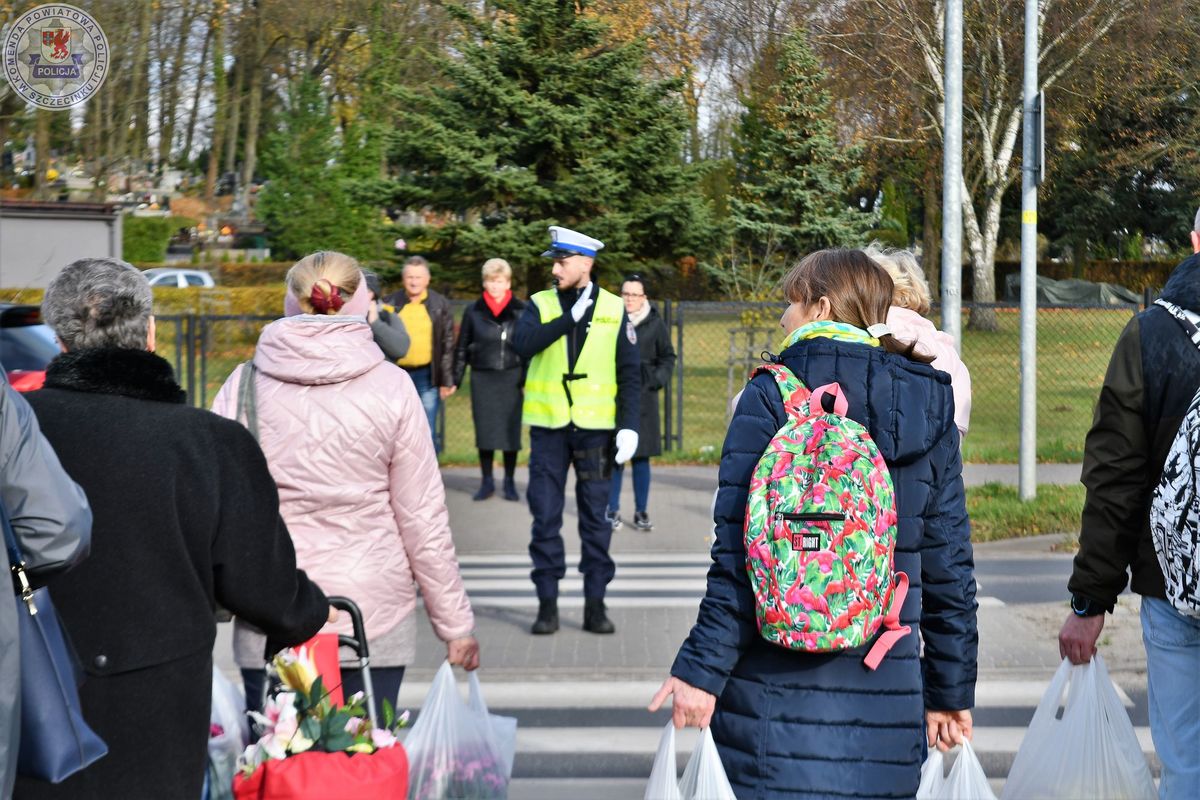 Policjanci z Komendy Powiatowej Policji w Szczecinku patrolują okolice cmentarzy, kierują ruchem oraz pomagają osobom, które mogą potrzebować wsparcia.