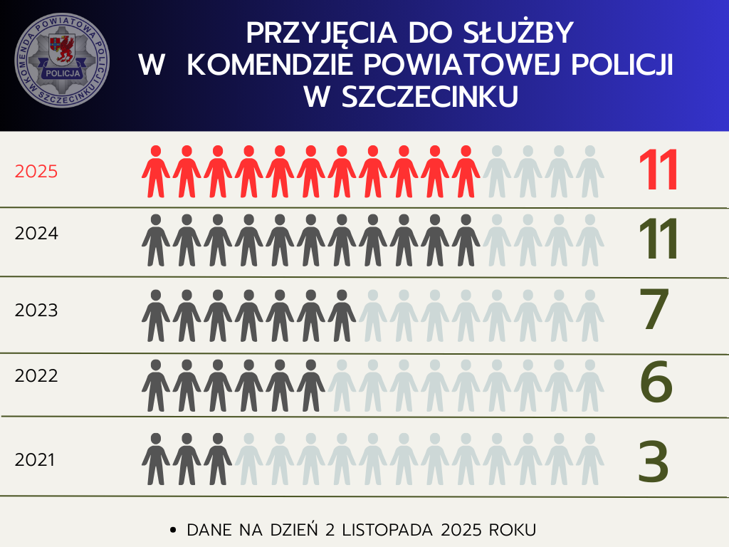 Jeszcze tylko 19 dni zostało do ostatniego w tym roku przyjęcia kandydatów do służby w Policji. Całoroczne działania w zakresie promocji zawodu policjanta przynoszą oczekiwane rezultaty. Dzięki spotkaniom z maturzystami, naszej obecności podczas plenerowych wydarzeń i rozmów z mieszkańcami Szczecinka na temat służby w Policji zauważalne jest zainteresowania naszą służbą. W Komendzie Powiatowej Policji w Szczecinku od kilku lat tendencja jest wzrostowa.