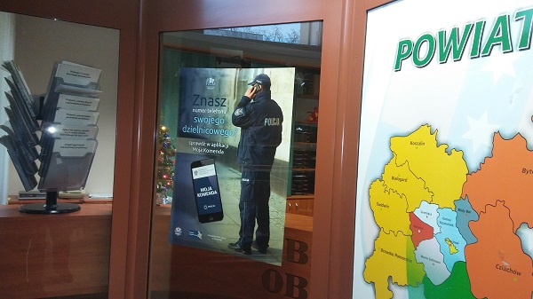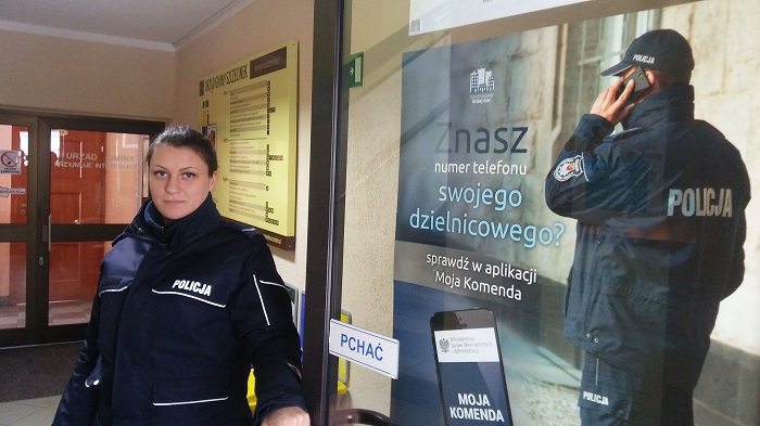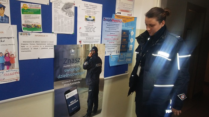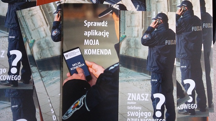 W ramach kampanii społecznej "Dzielnicowy bliżej nas" szczecineccy policjanci w swoich rejonach służbowych podczas spotkań z mieszkańcami rozdają broszury informacyjne zachęcając tym samym do korzystania z mobilnej aplikacji "Moja komenda", w której każdy mieszkaniec po adresie zamieszkania znajdzie swojego dzielnicowego i dogodny z nim kontakt mając do dyspozycji służbowy numer telefonu albo adres e-mail.