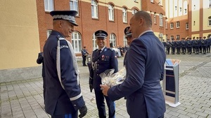 Kadra kierownicza zachodniopomorskiej Policji oraz zaproszeni goście uroczyście powitali insp. Szymona Sędzika, który w Warszawie podczas tegorocznych Centralnych Obchodów Święta Policji, z rąk Prezydenta Rzeczypospolitej Polskiej Adnrzeja Dudy, odebrał mianowanie na stopień nadinspektora Policji oraz generalską szablę.